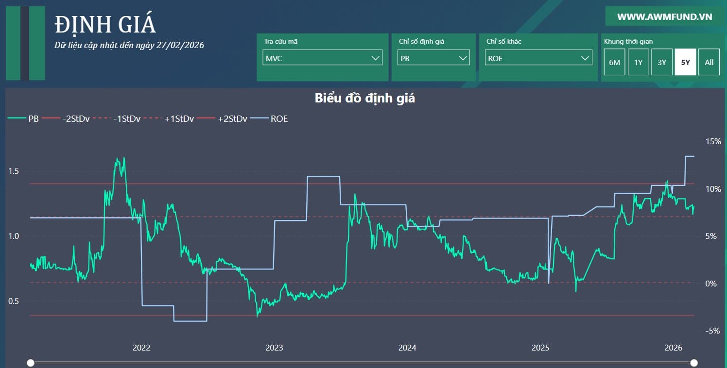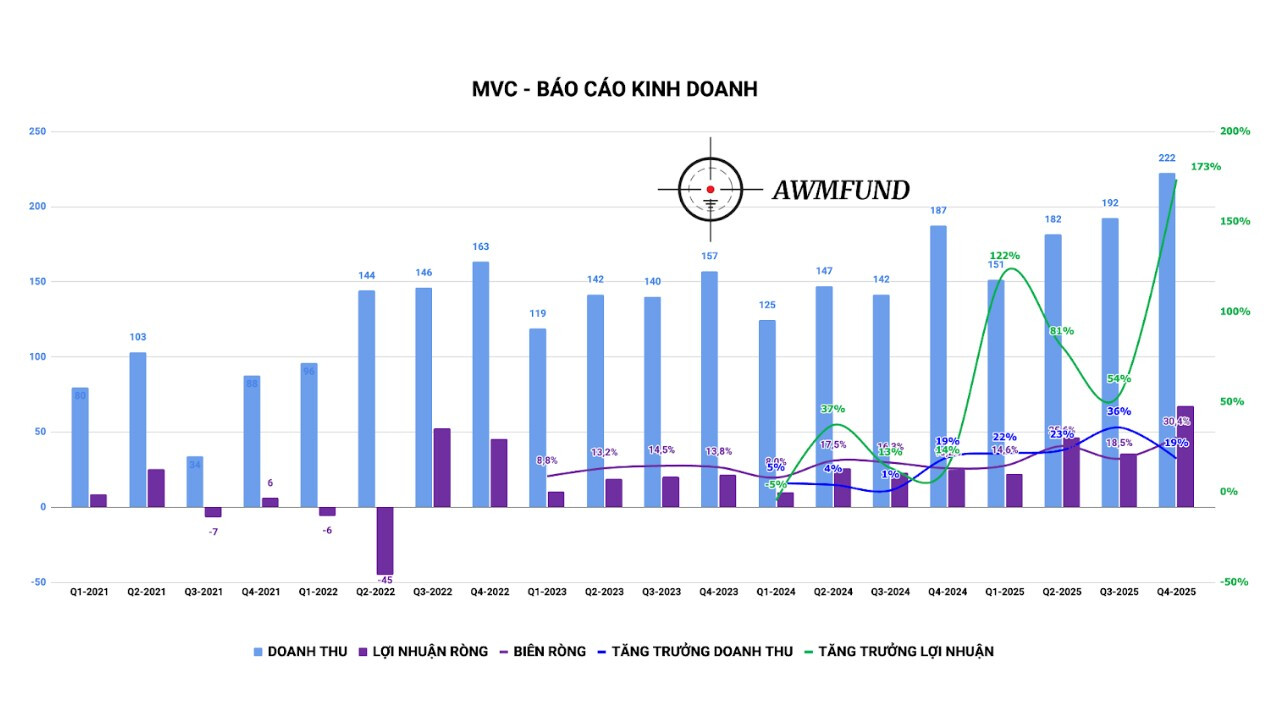 MVC vừa ra BCTC Q4 hết sức khả quan, doanh thu đạt 222.3 tỷ đồng, + 18.6% yoy, lãi sau thuế đạt 67.6 tỷ, + 173% yoy. Lãi gộp tăng gần gấp đôi lên 59 tỷ đồng, biên gộp cải thiện mạnh từ 17% lên 26%, dự báo sẽ tiếp tục tích cực trong năm 2026 khi giá bán mới tăng thêm 10% có hiệu lực từ tháng 1. Trong kỳ, MVC có sự hoàn nhập lại 25.5 tỷ tiền trích lập dự phòng tổn thất khi đầu tư vào NNC, cùng với đó là 20 tỷ lãi từ 3 công ty liên kết NNC, MCC và NHC là tác nhân chính gây đột biến lợi nhuận trong kỳ. Cả năm 2025, MVC ghi nhận 747.6 tỷ đồng, và lãi sau thuế đạt 171.7 tỷ, + 99% yoy.