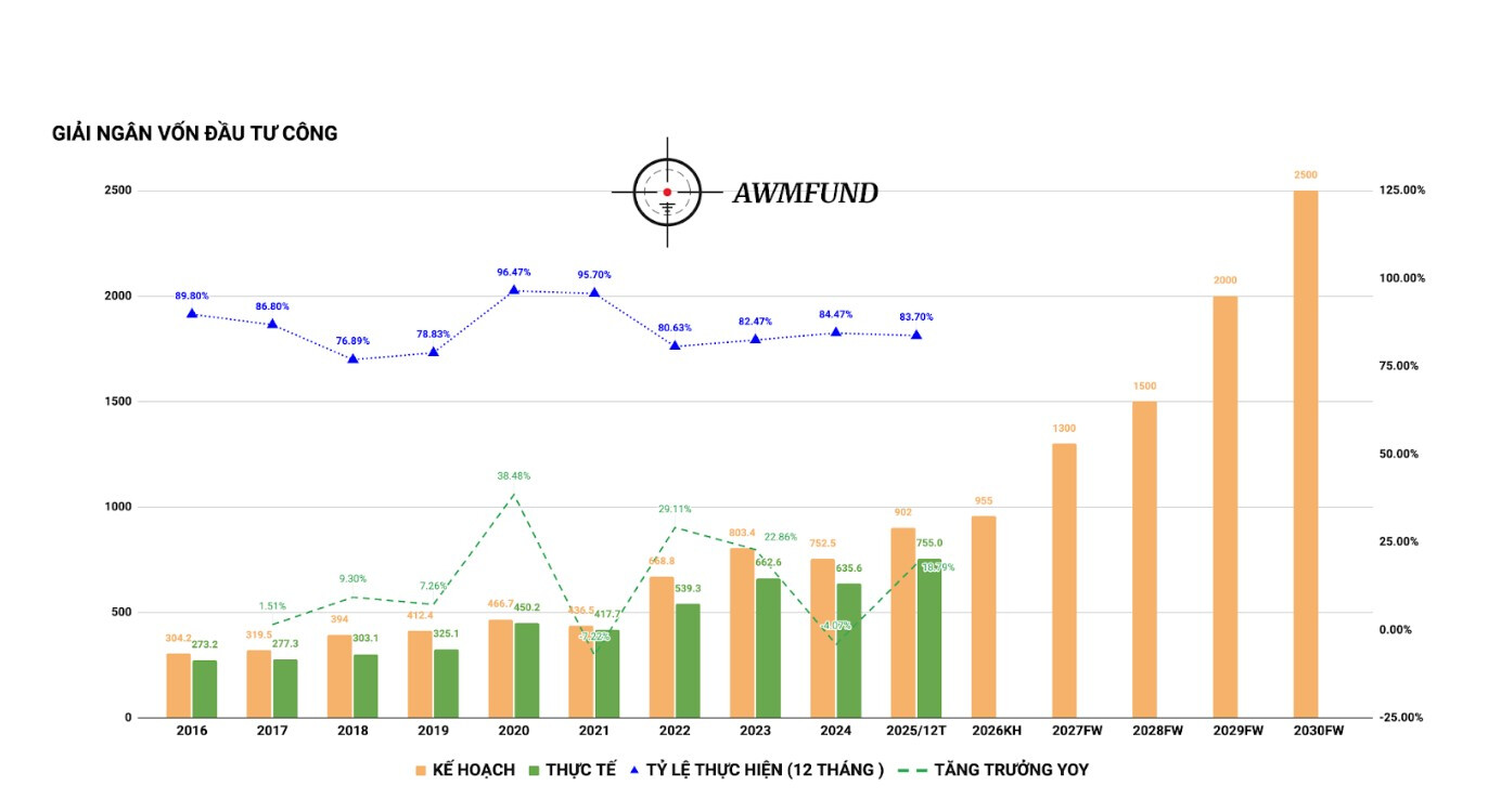 Chính phủ quyết tâm thực hiện 100% kế hoạch giải ngân đầu tư công trong năm 2025 tại thời điểm chốt 31/01/2026. Con số được giao trong năm 2026 tiếp tục ở mức cao, 955.000 tỷ đồng, cao nhất trong thập kỷ qua, và là bản lề cho kế hoạch đầu tư công trung hạn giai đoạn 2026-2030.