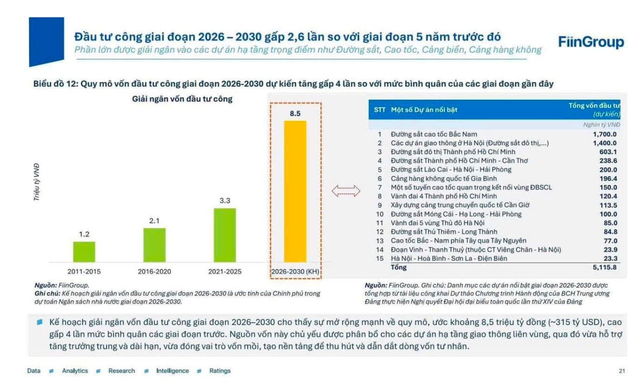 Tổng vốn đầu tư công trong giai đoạn 2016 - 2020 thực hiện được là 1.6 triệu tỷ, còn trong giai đoạn 2021 - 2025 là khoảng 3.1 triệu tỷ, tăng gần gấp đôi. Bước vào kỷ nguyên tăng trưởng của dân tộc, dự kiến tổng mức chi đầu tư công sẽ vào khoảng 8.3 triệu tỷ, gấp 2.5 lần so với giai đoạn trước đó.