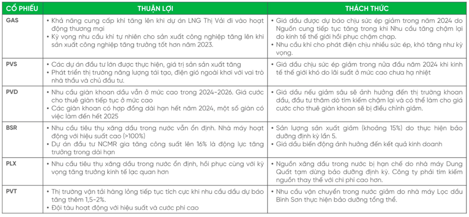 Mặt khác, ngành dầu khí trong nước sẽ phải đối mặt với không ít thách thức nếu giá dầu điều chỉnh giảm sâu xuống mức 50-60 usd/thùng, gây khó khăn cho hoạt động đầu tư, khai thác và kinh doanh của các doanh nghiệp trong ngành.Nhu cầu khí cho điện trong nước vẫn có khả năng tăng chậm. Năm 2024, Bộ Công thương xây dựng kế hoạch huy động khí cho điện ở mức 4,19-4,47 tỷ m3, bằng 86% ước thực hiện năm 2023.