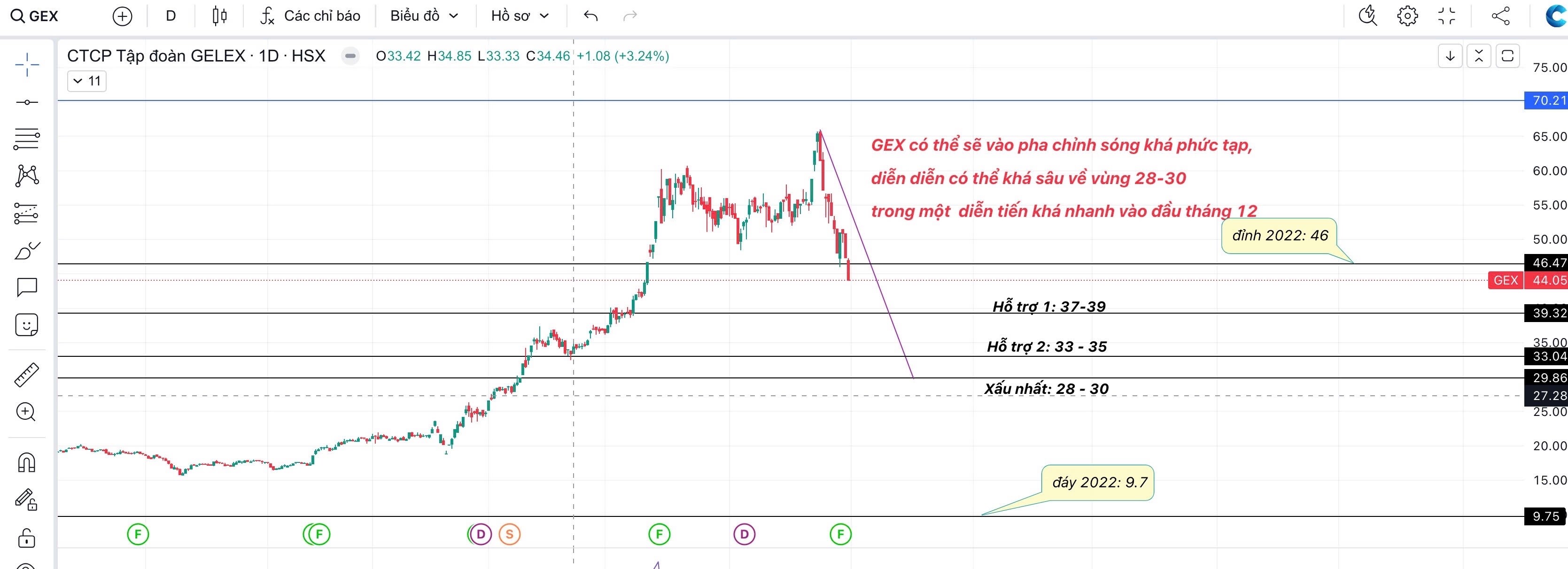 GEX có thể sẽ vào pha chỉnh sóng khá phức tạp, diễn diễn có thể khá sâu về vùng 28-30. (Khung thời gian ước tính tầm đầu 12/2025, ước lệ thuần kĩ thuật). Ngoài ra nếu dòng tiền tham gia tích cực thì sẽ dừng tại 33-35 (tuy nhiên xem cách đi quá khứ thì vùng này chưa đủ hấp dẫn với GEX).