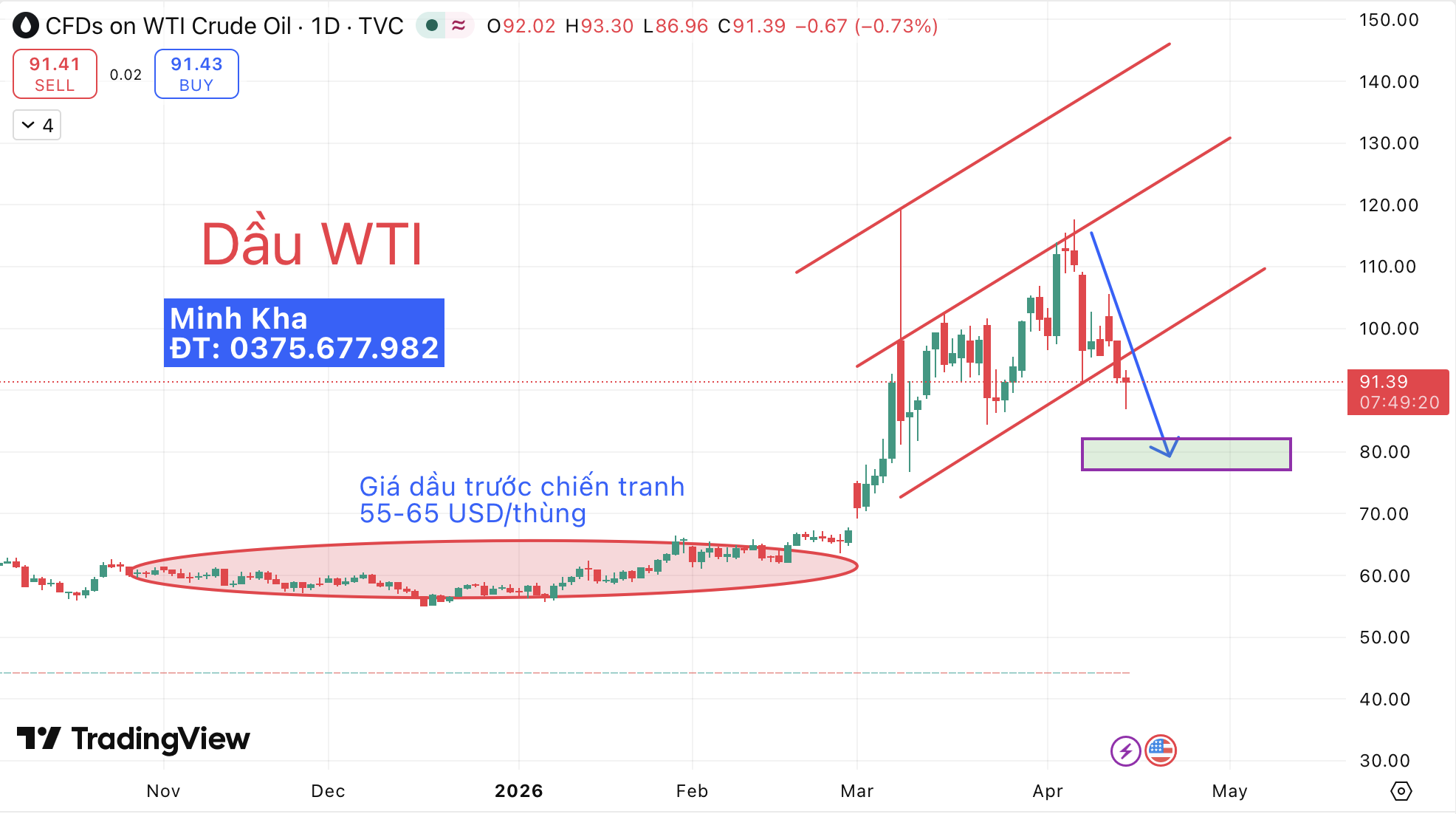 Xét trên đồ thị, kênh giá tăng (ngắn hạn) hình thành từ sau khi chiến tranh Iran nổ ra đã bị xuyên thủng tương ứng mốc 95 USD/thùng. Mục tiêu sau đó sẽ hướng tới vùng giá 80 USD/thùng.