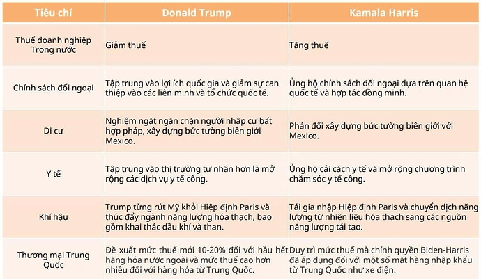 Với Kamala Harris: Là phó tổng thống trong chính quyền Biden, bà Harris ủng hộ các sáng kiến mang tính đa phương, nhấn mạnh thương mại tự do và các cam kết toàn cầu. Nếu lên nắm quyền, bà có thể tiếp tục thúc đẩy quan hệ đối tác với Việt Nam, tập trung vào hợp tác trong các lĩnh vực như chuỗi cung ứng, công nghệ xanh và chuyển đổi năng lượng. Điều này sẽ tạo ra các cơ hội đầu tư mới cho Việt Nam, đặc biệt trong những lĩnh vực đổi mới.