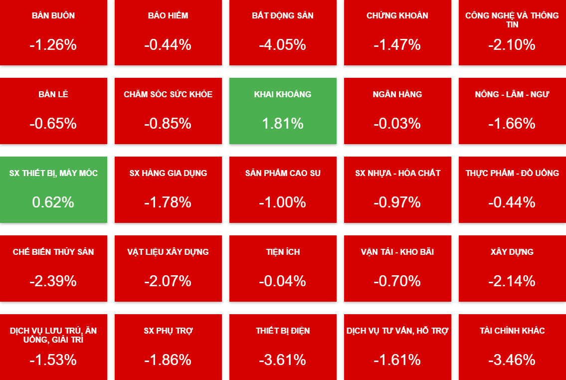 - Nhóm ngân hàng chia hai chiến tuyến khi một nửa đỏ nhẹ, một nửa giữ được sắc xanh vừa. Có lẽ nhóm NH xanh này chính là bàn tay chìa ra nắm kịp em VNI không rơi xuống vực sâu 1,215 mét trong hôm nay.