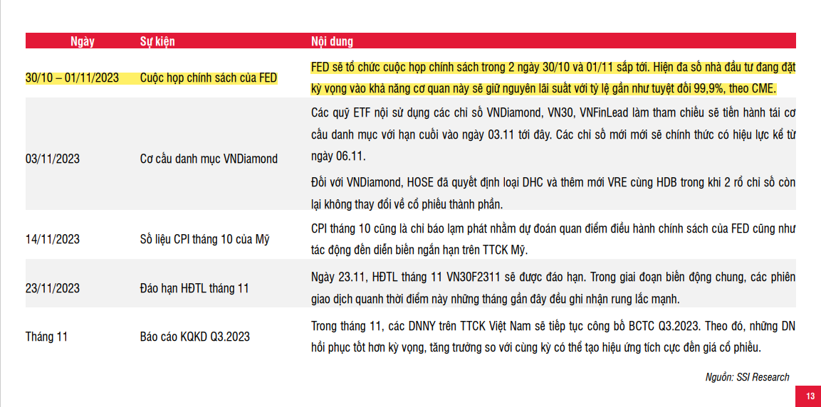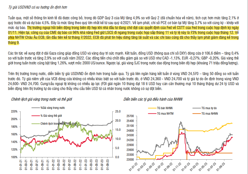 - Quyết định về lãi suất của FED sẽ được công bố sau cuộc họp vào ngày thứ Tư (01/11) với kỳ vọng chính là khung 5,25-5,5% được giữ nguyên và thị trường sẽ tập trung vào nhận định của FED về triển vọng lãi suất trong thời gian tới.