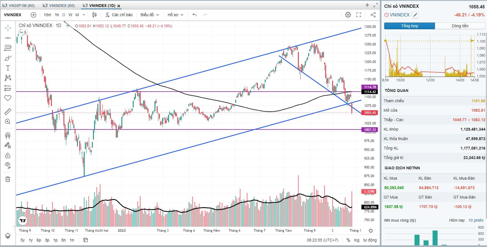 Phiên điều chỉnh mạnh nhất kể từ cuối tháng 8: Thị trường bị bán tháo mạnh ngay từ đầu phiên ngày thứ năm, khiến các chỉ số mở Gap Down lớn, sau khi có thông tin VHM phát hành trái phiếu chuyển đổi → Vnindex tìm đáy mới, quay về vùng nền giá được hình thành từ tháng 2 đến tháng 5 từ 1050-1030 điểm. Thanh khoản cao đột biến.