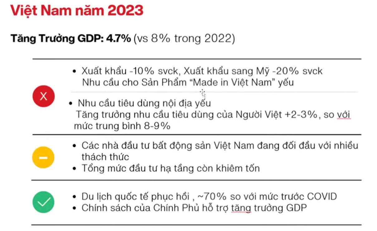 VinaCapital cũng dự đoán tăng trưởng GDP Việt Nam năm 2024 có thể đạt 6.5%. Năm 2024, VinaCapital kỳ vọng tăng trưởng GDP Việt Nam sẽ phục hồi lên 6.5%, nhờ xuất khẩu phục hồi; kèm theo đó là sự phục hồi sản lượng ngành sản xuất của Việt Nam, từ mức không tăng trưởng năm 202, lên mức tăng trưởng 8-9% vào năm 2024, so với mức tăng trưởng trung bình dài hạn 12% của ngành này trước COVID-19.