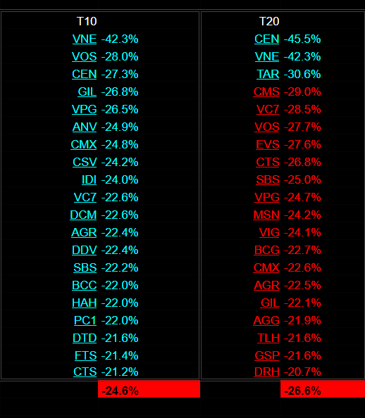 - Các nhóm ngành nâng đỡ thị trường hồi T+ sau nhịp giảm sâu trước đó: BĐS + Chứng khoán + Họ V. Nhóm này có dấu hiệu quay đầu giảm tiếp thì NĐT nên thận trọng lại.
