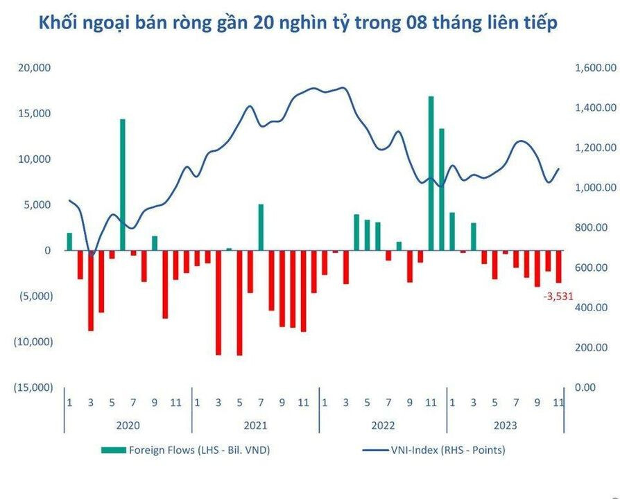 Ngoại bán ròng khá mạnh trên sàn trong tháng 11, lên tới 3,5 nghìn tỷ đồng và bán ròng gần 13 nghìn tỷ đồng kể từ đầu năm tới nay. Khối ngoại bán ròng từ đầu năm đến nay tập trung ở một số mã cổ phiếu nhất định, đa phần đều là CP trụ trong VN30.