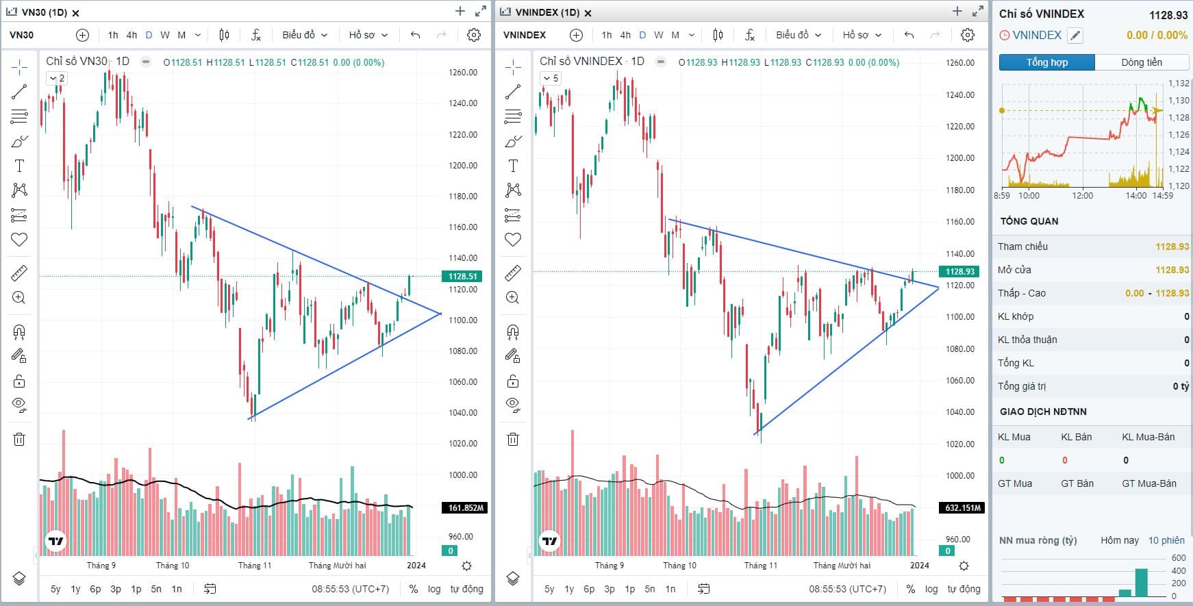 Vnindex tiếp tục xây vùng cân bằng: Tin xấu nhất lại là tin tốt nhất, thị trường hấp thụ tốt sau sự kiện VFS và Vạn Thịnh Phát. Hiện tại Vnindex gần như đã tạo nền đáy tháng 11/2023 và tiếp tục xu hướng hồi phục. Ngưỡng cản gần nhất cần vượt vùng kháng cự cũ vùng 1127± điểm để xác nhận xu hướng tăng tiếp tục.