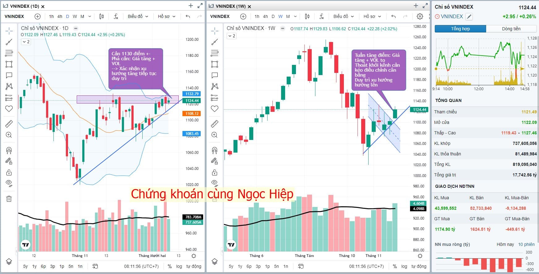 TIẾP TỤC ĐÓN SÓNG CUỐI NĂM - Tuần quyết định Xu Hướng - Thông tin đáng chú ý: Vnindex tuần rồi: Hồi phục với giá tăng đi kèm với khối lượng thuyết phục. Xác nhận thoát kênh xu hướng giảm. Tiệm cận vùng kháng cự đỉnh cũ 1130 điểm ± và duy trì xu hướng hướng lên.