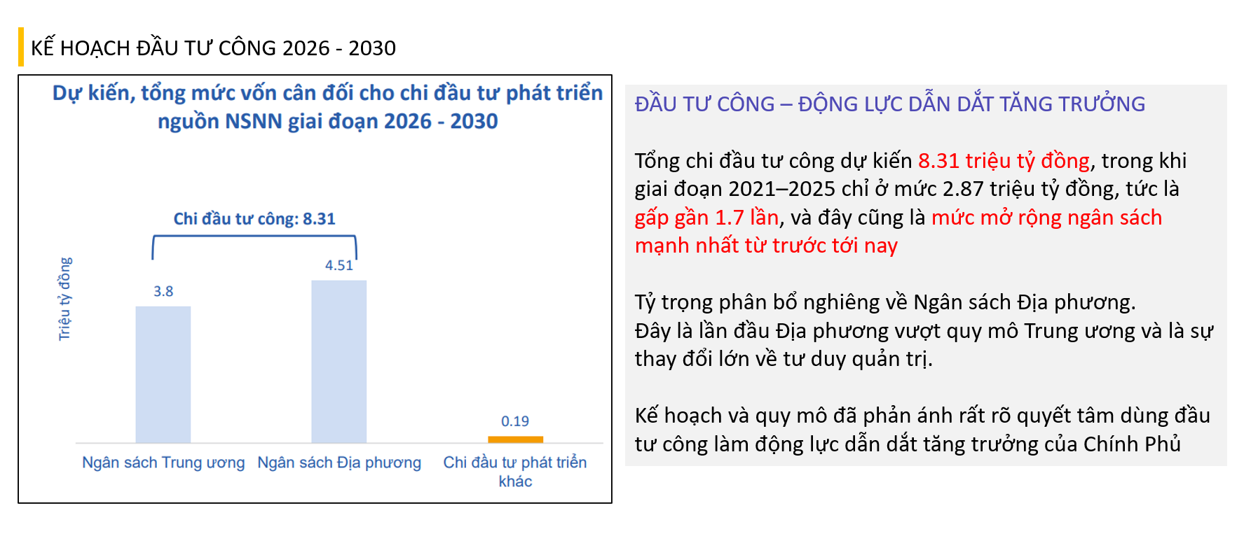 Tại Quy hoạch Việt Nam giai đoạn 2026 – 2030 và đáng chú ý là kế hoạch chi đầu tư công với Tổng chi đầu tư công dự kiến 8.31 triệu tỷ đồng, trong khi giai đoạn 2021–2025 chỉ ở mức 2.870 triệu tỷ, tức là kế hoạch sắp tới sẽ tăng gần 1.7 lần so với giai đoạn cũ, đánh dấu mức mở rộng ngân sách mạnh nhất từ trước tới nay