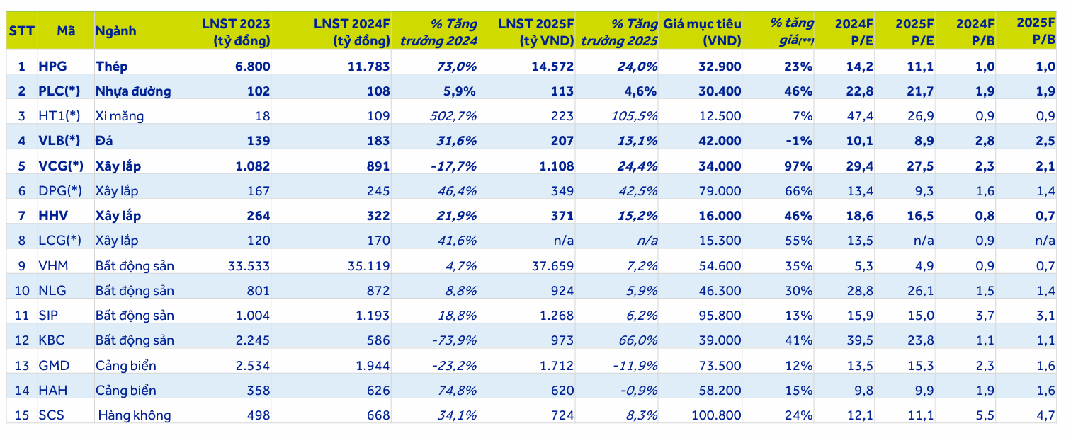 - Các nhóm cổ phiếu dự kiến sẽ hưởng lợi từ đầu tư công bao gồm cổ phiếu ngành thép (HPG), xi măng (PLC), nhựa đường, logistics, và bất động sản. Các cổ phiếu khuyến nghị gồm HPG, PLC, VLB, VCG, HHV.