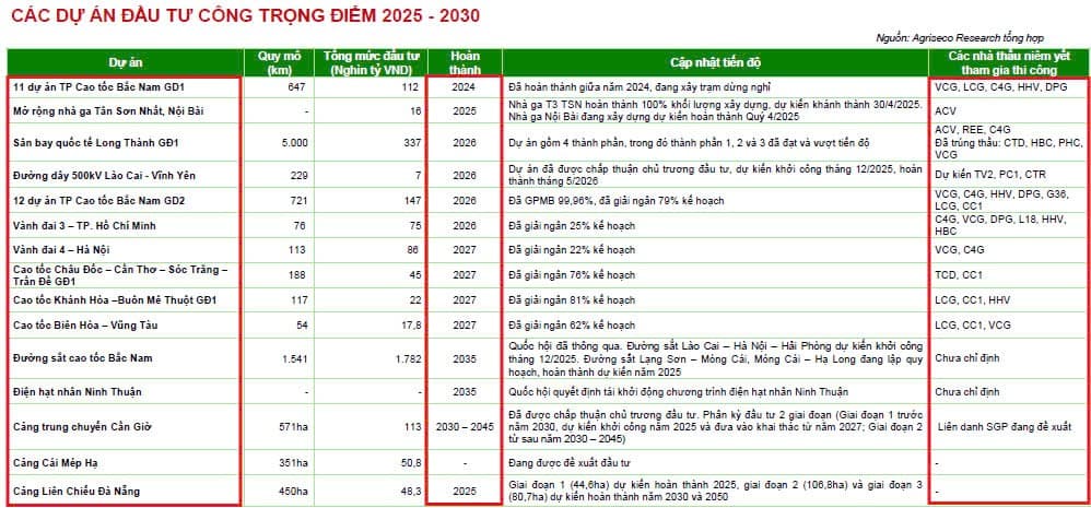 Trong đó, VCG trúng các gói thầu lớn tại sân bay Long Thành (gói 4.7 – 4.8 – 5.1) và gói mở rộng nhà ga T2 Nội Bài, vành đai 4. Còn HHV thì có vị thế lớn với các dự án cao tốc Bắc Nam, Đồng Đăng – Trà Lĩnh, dự án ven biển, đường hầm…