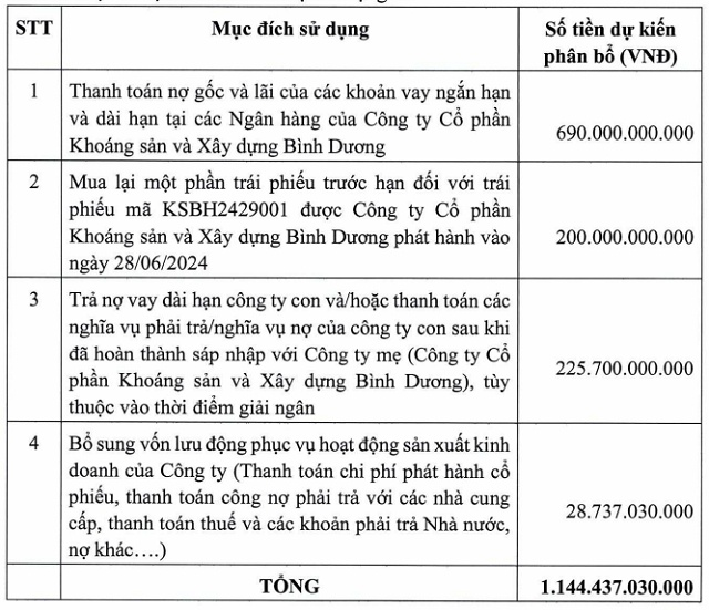 Trong tổng số tiền dự kiến huy động, KSB sẽ dùng 690 tỷ đồng để trả nợ gốc và lãi các khoản vay ngắn hạn, dài hạn cho ngân hàng; 200 tỷ đồng để mua lại một phần trái phiếu trước hạn (mã KSBH2429001) phát hành giữa năm 2024; gần 226 tỷ đồng để thanh toán nghĩa vụ nợ của công ty con sau sáp nhập; phần còn lại dùng bổ sung vốn lưu động, bao gồm thanh toán công nợ, thuế và các khoản phải trả Nhà nước.