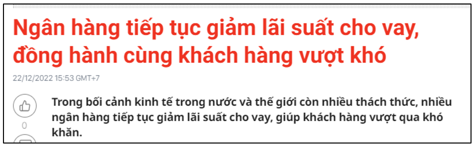 - Các ngân hàng đang đồng loạt giảm lãi suất, gần đây nhất là ngân hàng VCB đã giảm hơn 1% cho các khoản vay của khách hàng Doanh nghiệp, hỗ trợ thanh khoản cho hệ thống cung tiền ra nền kinh tế. Tiếp theo đó, HDB cũng có các chính sách hỗ trợ doanh nghiệp lên đến 3.5% dịp cuối năm. Nam A Bank vừa triển khai giảm lãi suất cho vay từ 1.5% đến 2.5%/năm nhằm đồng hành cùng doanh nghiệp vượt qua khó khăn, đẩy mạnh sản xuất kinh doanh dịp Tết.