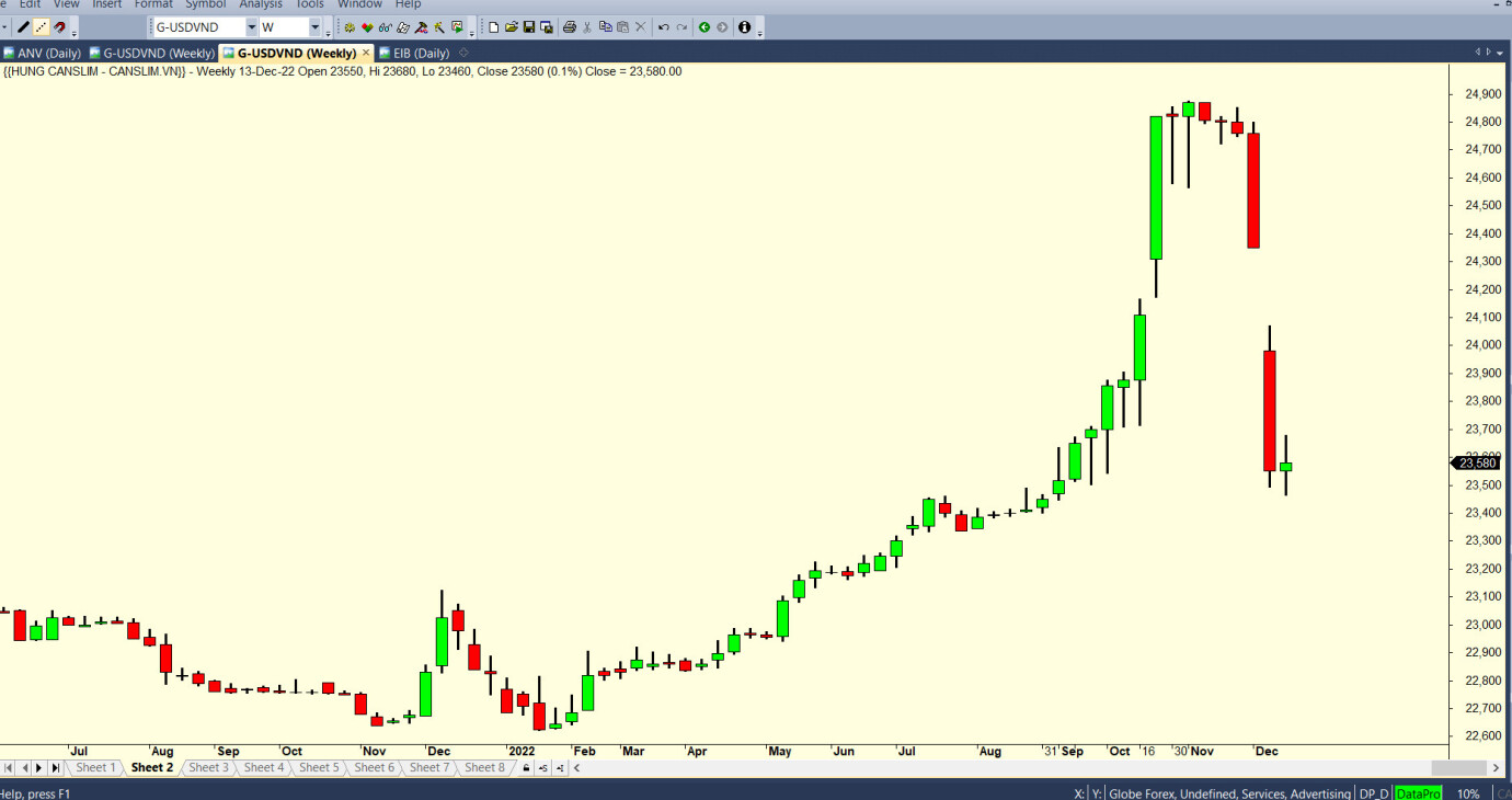 - Tuy nhiên ở hiện tại, chỉ số Dolar Index đã tạo mô hình 2 đỉnh và giảm sâu, giá USD giảm từ mức đỉnh 25000 giảm về 23550. Vì vậy mà thông tin này sẽ không còn gây áp lực lên lãi suất Việt Nam, từ đó lãi suất Việt Nam sẽ ngừng tăng và có xu hướng giảm trong năm 2023.