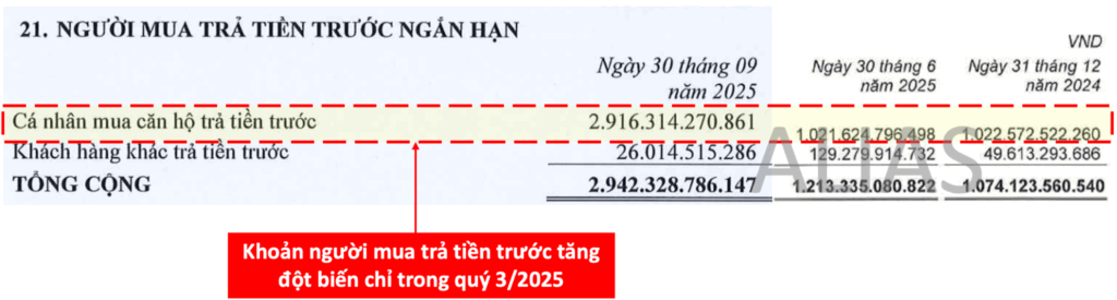 Chỉ trong quý 3/2025, khoản cá nhân đặt cọc căn hộ tăng đột biến, gấp 2,85 lần so với giá trị tại thời điểm quý 2/2025. Nhiều khả năng đây chính là dòng tiền từ đợt mở bán Giai đoạn 1 của Gem Riverside (The Privé). Đây là tín hiệu rất tích cực cho thấy sức hấp thụ dự án đang rất tốt, chỉ còn chờ book doanh thu, lợi nhuận. Dự báo doanh thu từ Gem Riverside sẽ bắt đầu được ghi nhận từ năm 2026.