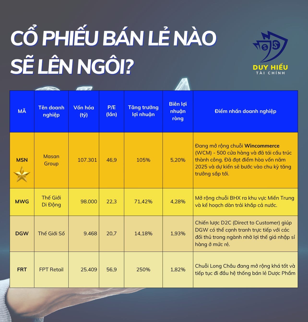Bên dưới là TOP 4 doanh nghiệp BÁN LẺ nổi bật trên thị trường chứng khoán mà Hiếu tổng hợp.