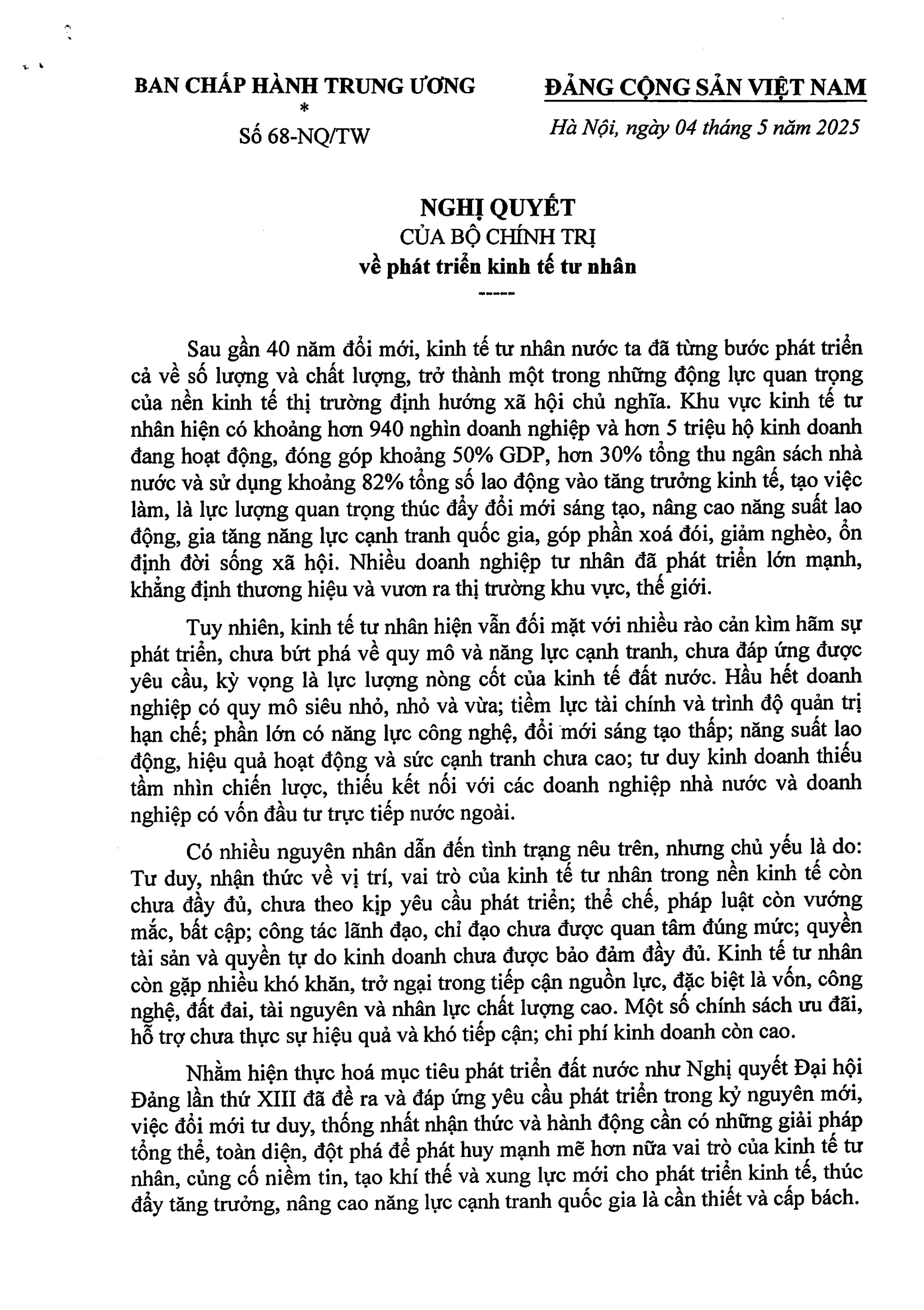 Hôm nay, một sự kiện chính trị – kinh tế quan trọng đã diễn ra, có thể trở thành bước ngoặt đối với nền kinh tế Việt Nam trong nhiều năm tới: Bộ Chính trị đã chính thức ban hành Nghị quyết số 68, xác định khu vực kinh tế tư nhân là động lực quan trọng nhất để phát triển đất nước. Đây không chỉ là một thông điệp mạnh mẽ về mặt tư tưởng, mà còn là lời cam kết cụ thể cho hàng loạt chính sách cải cách sẽ được triển khai trong thời gian tới.