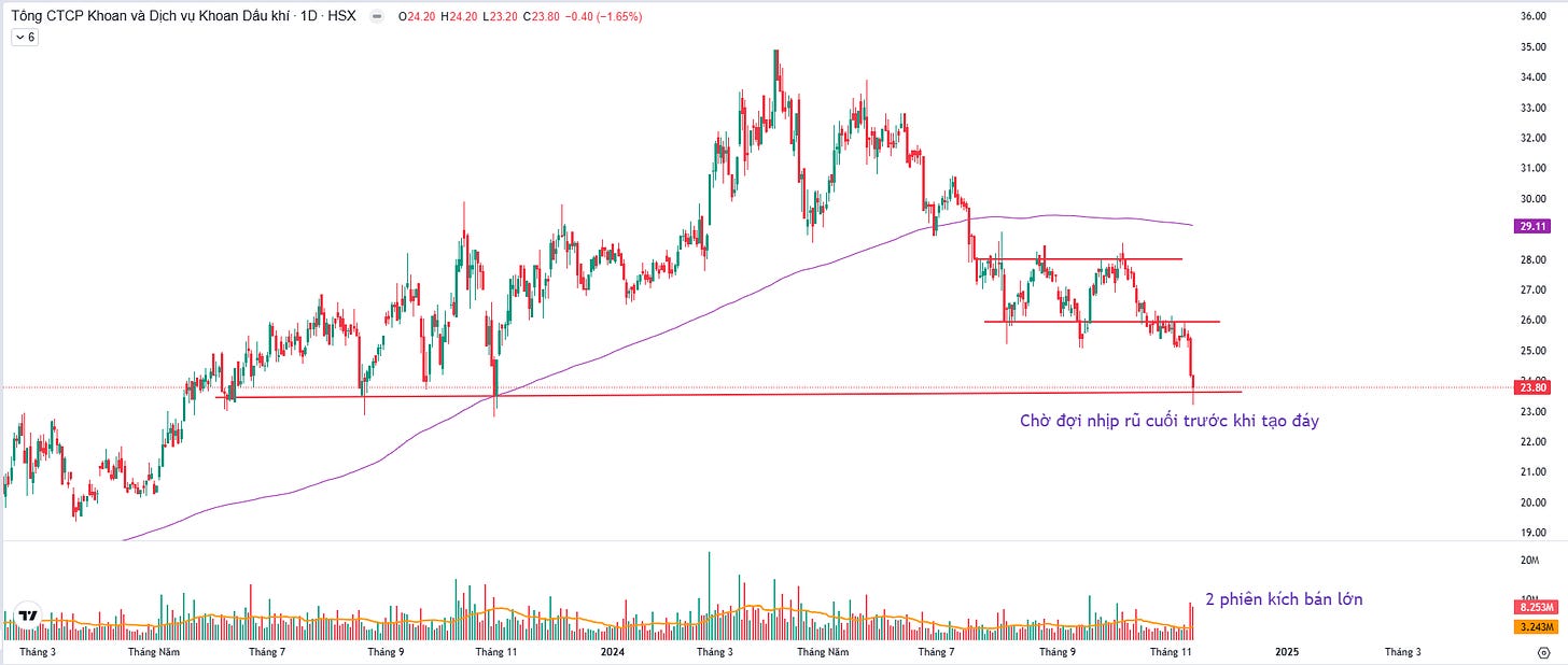 PVD sau quá trình dừng rơi tạo biên cân bằng tại vùng giá 25.5-28 thì có đã tiếp tục thủng đáy. Hai phiên giao dịch gần đây có volume bán rất bùng nổ - đây là tín hiệu tốt cho cổ phiếu ở vùng đáy đặc biệt khi PVD đã về mức hỗ trợ đáy quanh 23. Lúc này khi tín hiệu nổ volume đã có, nhịp hoảng loạn cắt lỗ đã có chúng ta có thể chờ đợi những tín hiệu rũ bỏ cuối cùng trước khi tạo đáy của cổ phiếu này.