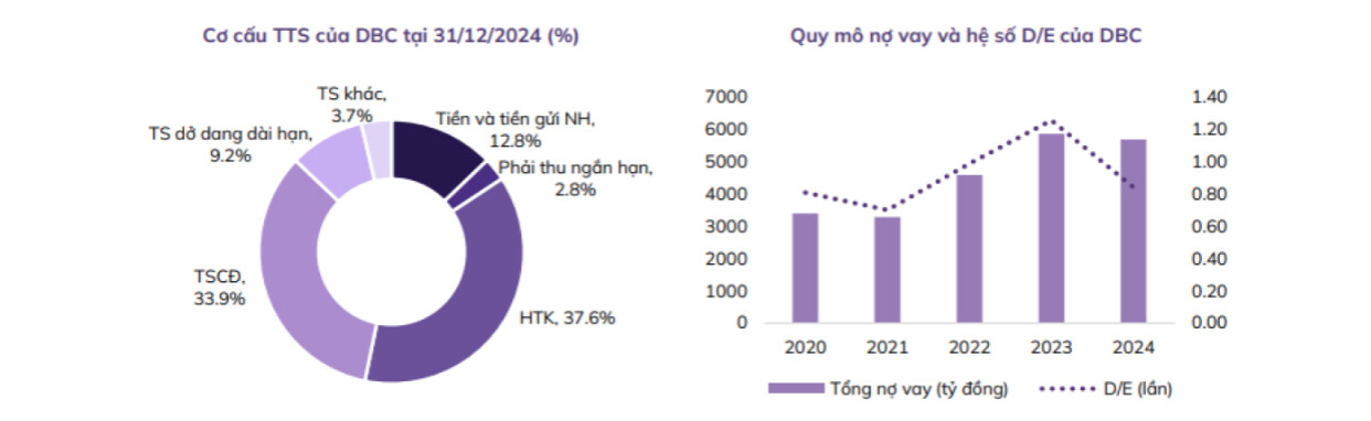Các khoản phải thu của DBC giảm nhẹ 5,2% so với đầu năm, đạt 402 tỷ đồng, chiếm 2,8% tổng tài sản. Tuy nhiên, công ty không trích lập dự phòng cho các khoản phải thu, điều này có thể tiềm ẩn rủi ro về cơ cấu tài sản.