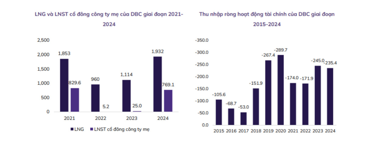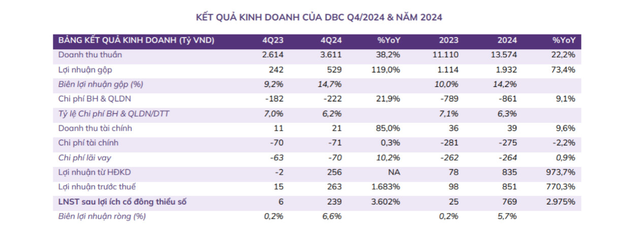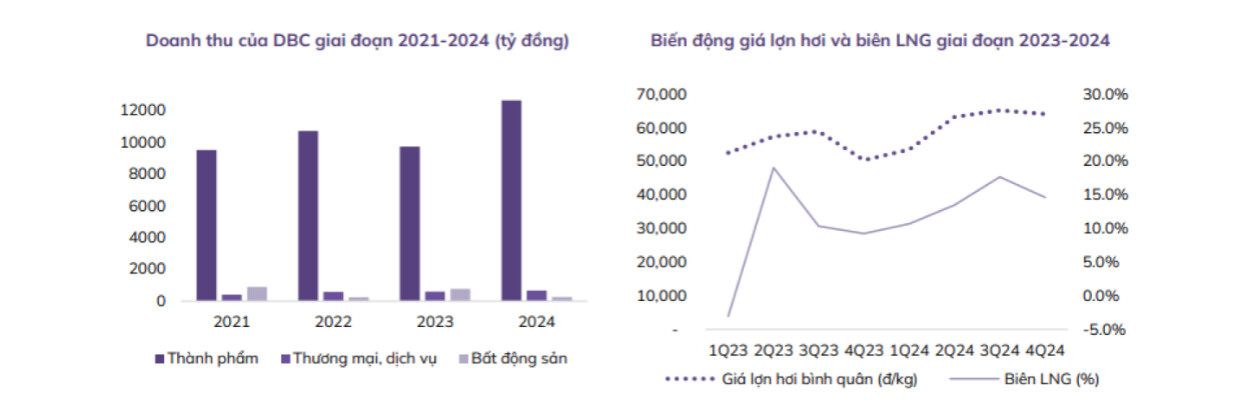 Mảng TACN của DBC năm 2024 ghi nhận sự tăng trưởng tích cực nhờ giá nguyên liệu đầu vào như ngô và đậu tương giảm, trong khi nhu cầu sử dụng TACN tăng mạnh khi dịch bệnh được kiểm soát và người dân tái đàn trở lại. Đặc biệt, mảng chăn nuôi, tập trung vào chăn nuôi lợn giống và lợn thịt, có mức tăng trưởng mạnh do giá lợn hơi liên tục tăng từ đầu năm và duy trì ở mức cao trong suốt nửa cuối năm 2024.