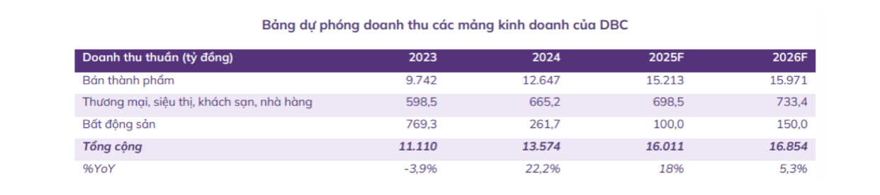 Mảng bất động sản của DBC không phải lĩnh vực kinh doanh chính và thường biến động tùy theo tiến độ bàn giao dự án. Năm 2024, công ty không có dự án bất động sản lớn nào được hoàn thành, tuy nhiên vẫn ghi nhận doanh thu 261,7 tỷ đồng từ việc hoàn thiện trung tâm thương mại Huyền Quang và Lý Thái Tổ cũng như dự án cảng Dabaco giai đoạn 2 đi vào hoạt động.