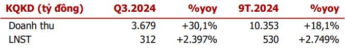 Lũy kế 9 tháng đầu năm 2024, DBC đạt doanh thu 10.353 tỷ đồng, tăng 18,1% yoy, và LNST đạt 530 tỷ đồng, gấp hơn 28 lần cùng kỳ năm trước. Kết quả này cho thấy Dabaco đã tận dụng tốt điều kiện thị trường thuận lợi để đạt được mức tăng trưởng mạnh mẽ, khẳng định tiềm năng phát triển của công ty trong lĩnh vực nông nghiệp và chăn nuôi.