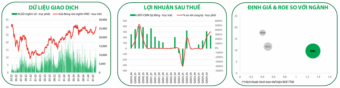 - Chúng tôi kỳ vọng giá heo hơi sẽ duy trì ở mức cao tại ngưỡng trên 72.000 đồng/kg tới giữa tháng 4/2025 khi (1) dịch bệnh tại một số địa phương ở miền Bắc tiếp tục diễn biến phức tạp khiến nguồn cung còn suy giảm, (2) nguồn cung tại phía Nam tiếp tục thiếu hụt cho tới tháng 5/2025 do lượng đàn bổ sung sau quãng thời gian bùng dịch mạnh trong nửa cuối năm ngoái chưa đến giai đoạn thu hoạch và (3) nguồn cung heo bổ sung qua các đường biên giới bị thắt chặt. Tất cả điều này giúp KQKD của DBC sẽ tăng trưởng mạnh trong nửa đầu năm.