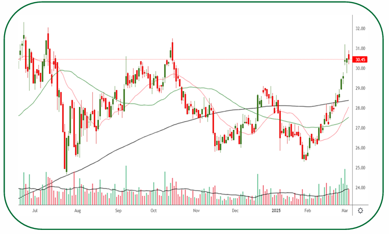 Sau đợt giảm giá dưới ngưỡng hỗ trợ 26 với thanh khoản thấp trong tháng 1/2025, DBC đã nhanh chóng hồi phục trở lại trên ngưỡng này và bắt đầu xu thế tăng. Diễn biến tăng giá đã giúp DBC lần lượt vượt qua các ngưỡng cản 27, 28, 29 và hiện tại DBC đang thử thách ngưỡng cản 31. DBC đang gặp khó khăn tại vùng cản này do diễn biến tăng giá diễn ra nhanh nên nguồn cung chốt lời khá lớn. Áp lực cản này có thể gây sức ép rung lắc và lùi bước cho DBC nhưng dự kiến DBC sẽ nhanh chóng được hỗ trợ tại vùng 29 - 30 và hồi phục trở lại nhờ xu thế chung vẫn theo hướng tích cực.