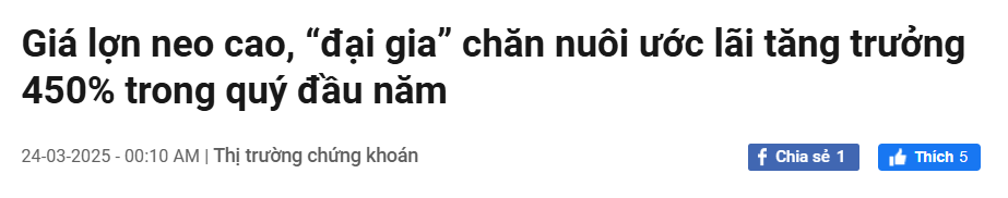 - Giá heo hơi trong nước duy trì ở mức cao , tạo điều kiện thuận lợi cho biên lợi nhuận DBC. Giá lợn hơi neo cao đang giúp các doanh nghiệp chăn nuôi như Dabaco ghi nhận lợi nhuận tăng trưởng mạnh. Dự báo quý 1/2025, lợi nhuận của DBC có thể tăng trưởng tới 450% so với cùng kỳ (Giá lợn neo cao, “đại gia” chăn nuôi ước lãi tăng trưởng 450% trong quý đầu năm)