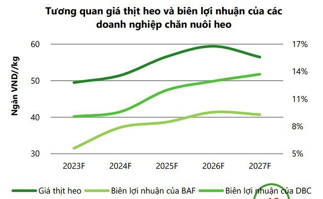 Trong khi đó, ở chiều bán ra, báo cáo ngành chăn nuôi của VCBS cho biết, nguồn cung thịt heo đang sụt giảm mạnh sau giai đoạn người chăn nuôi thua lỗ và không dám tái đàn. Việc giảm đàn lợn đã khiến nguồn cung thịt lợn giảm trong bối cảnh sức mua đang tăng trở lại có thể giúp giá thịt heo tăng mạnh và neo giá ở mức cao.Yếu tố thịt heo tăng giá - theo VCBS- có thể giúp doanh nghiệp chăn nuôi tăng biên lợi nhuận thêm khoảng 6 - 14%.