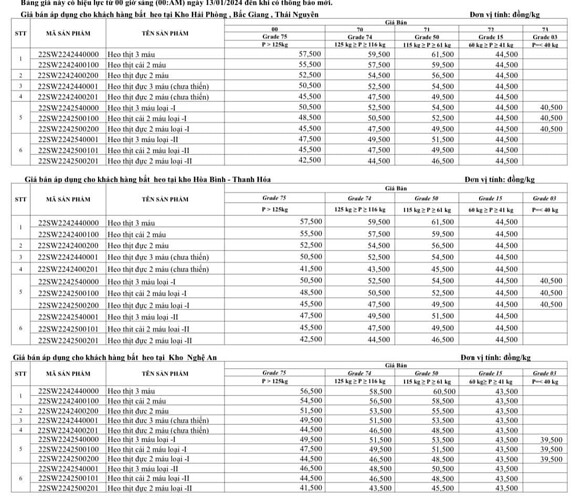 Hai tỉnh Hà Tĩnh và Thanh Hóa lần lượt tăng 3.000 đồng/kg và 4.000 đồng/kg lên mức tương ứng là 54.000 đồng/kg và 55.000 đồng/kg.