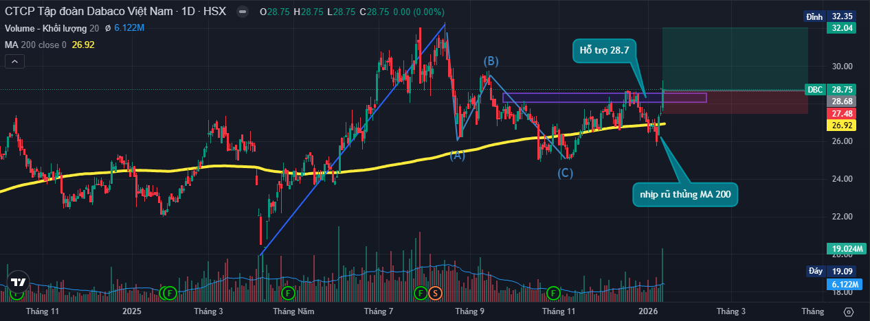 DBC đã hoàn tất sóng thứ cấp điều chỉnh ABC, xuất hiện sóng thứ cấp tăng mới. Ngoài ra DBC có nhịp rũ thủng MA200 rồi bật lại với vol thấp cho thấy lực bán không còn quá chủ động thể hiện thiên hướng cạn cung.
