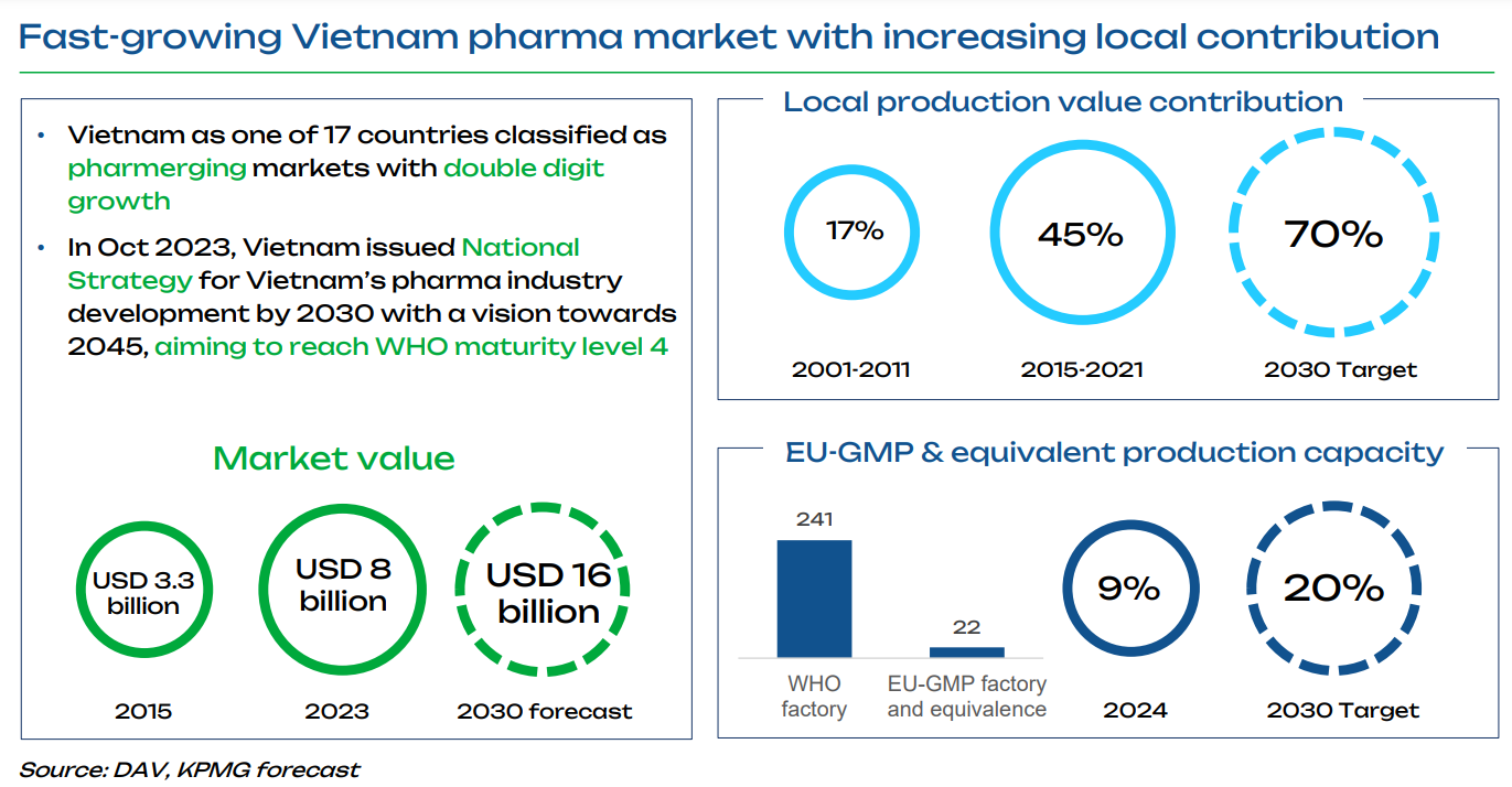 Sau nhiều cải cách về chính sách, thực hiện chiến lược Quốc Gia phát triển ngành dược Việt Nam giai đoạn 2025 - 2030 và tầm nhìn 2045, 80% thuốc phải được sản xuất trong nước đáp ứng 70% nhu cầu điều trị, dược liệu trong nước đáp ứng 20% nhu cầu sản xuất. Thị trường dược phẩm với qui mô 7.8 tỷ USD năm 2023, được dự báo đạt 16.1 tỷ USD năm 2026 (VIRAC), 16 tỷ USD 2030 (KPMG Forecast).