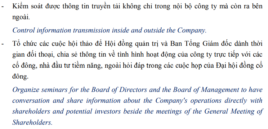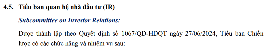 giai đoạn từ 2024 trở về trước: có tận 3 tiểu ban làm việc nhố nhăng được chăng hay chớ, thì từ cuối tháng 6/2024 đã cắt giảm về còn 2 tiểu ban: Tiểu ban chiến lược và Tiểu ban quan hệ NĐT. Có thể thấy đây là bước thay đổi nhận thức rất lớn với đám xứ nẫu. Tôi cũng giật hết cửa mình khi đến thời điểm này đội lờ đờ bê đê mới nhận thức được IR cũng là việc rất quan trọng với 1 công ty đại chúng và được thành lập hẳn 1 tiểu ban. Xin trích dẫn nhiệm vụ của tiểu ban quan hệ cổ đông: