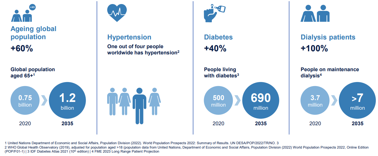 Dialysis patients: Có nhiều loại bệnh thận, số liệu này hàm ý các bệnh nhân chạy thận giai đoạn cuối ESRD (end-stage renal disease), có thể tăng từ 3,7 triệu năm 2020 lên hơn 7 triệu 2035.