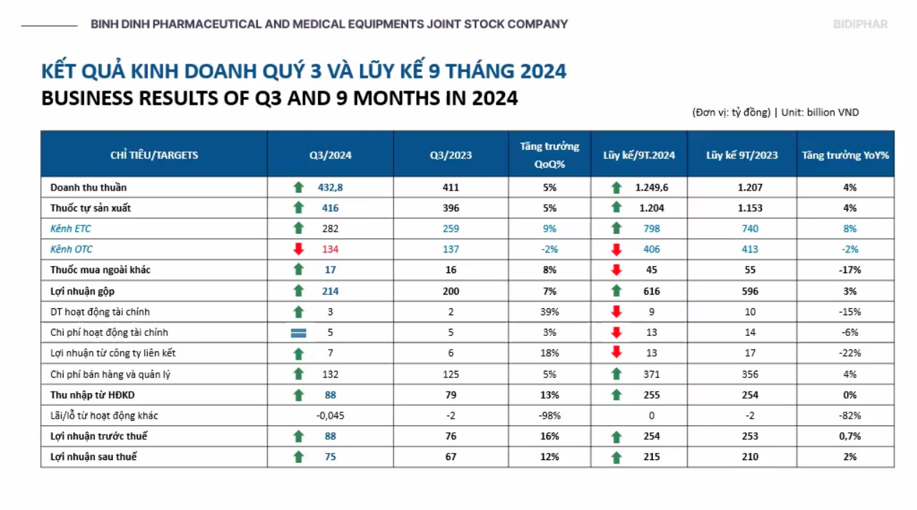 KQKD 9T đây anh em, dthu tăng 5%, lntt tăng 16%. Hiếm có cty dược nào tăng trưởng lợi nhuận trong 9T2024.