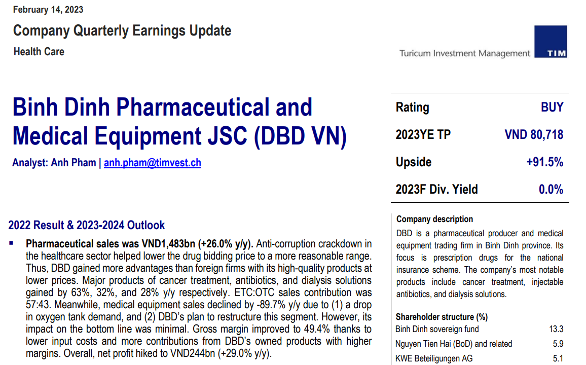 Mối lương duyên giữa Crearene theo suy đoán cá nhân tôi nhiều khả năng đến từ nhóm cổ đông thụy sĩ KWE và TIM. KWE có gốc Thụy Sĩ, thuộc 1 cái holding có tên là Corisol, nhóm này xuất phát điểm từ những người làm trong ngành healthcare. Sau khi bán IMP năm 2022, vài tháng sau họ đã đầu tư vào DBD, 2 năm qua họ vẫn ròng rã mua, giá thấp cũng mua, 5x 6x gì đều mua nốt, chắc có thể nâng sở hữu lên 15% 20% 25% cũng k chừng, vơ vét hết phần 18% cổ phiếu trôi nổi còn lại. KWE rất có duyên với ngành dược khi họ đã mua IMP với giá sau điều chỉnh cổ tức ở mức rất thấp, và bán cho SK thu về lợi nhuận từ 500 - 600%, tôi không có giá mua bình quân, mức lợi nhuận này tính từ giá bắt đầu mua. Còn đối với TIM, họ đã cử Ms Giang - Head of Research vào HĐQT, tôi suy đoán fund này có vai trò tư vấn cho KWE. Một tài liệu phân tích của TIM định giá DBD năm 2023 khi KWE mới bắt đầu nâng sở hữu lên 5% cuối 2022 đầu 2023 đã là 80.718 đồng/cổ phiếu, với lợi nhuận kỳ vọng lúc đó là 91.5%, một team phân tích xuất sắc, nhìn xa trông rộng. Với những giả định đầu vào mới như hiện nay, phong cách chơi lớn và ăn dày của KWE, tôi đoán chắc định giá của DBD trong mắt TIM và KWE chắc sẽ không có 2 chữ số, đặc biệt khi họ biết quá rõ tìm năng dịch thận.
