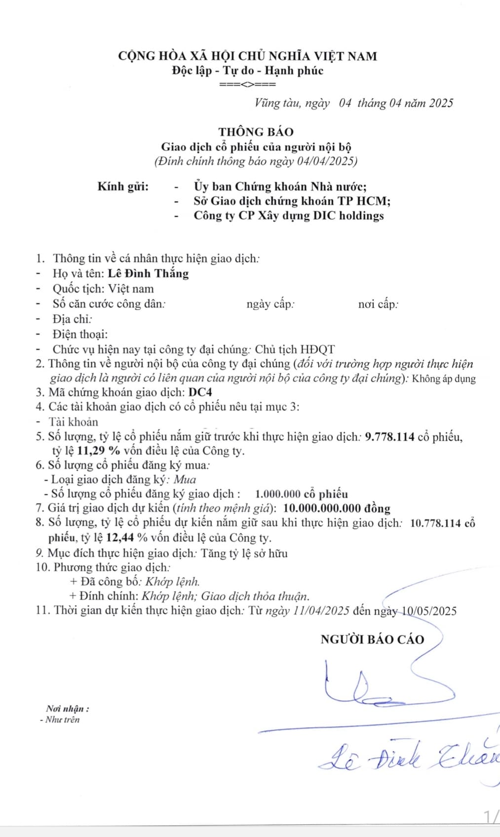Theo đó, ông Lê Đình Thắng- Chủ tịch HĐQT DIC Holdings vừa đăng ký mua vào 1 triệu cổ phiếu DC4 nhằm mục đích tăng tỷ lệ sở hữu. Giao dịch dự kiến diễn ra bằng phương thức khớp lệnh trong khoảng thời gian từ ngày 11/4/2025 đến ngày 10/5/2025.