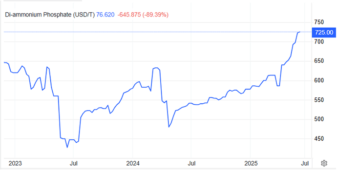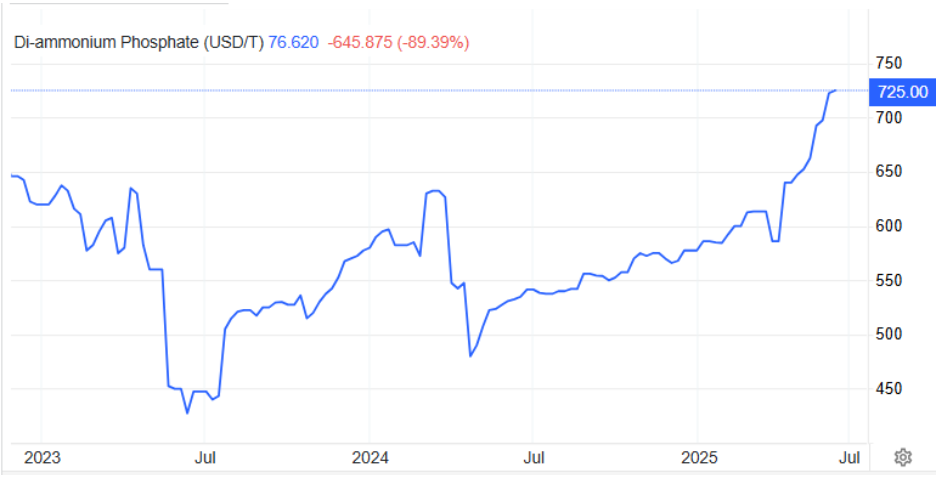 Như đã nói ở trên, để sản xuất phân NPK thì các doanh nghiệp trong nước ta buộc phải nhập khẩu Kali và DAP từ Nga, Trung Quốc và Trung Đông. Trên thực tế, giá DAP đã tăng mạnh trong thời gian qua bởi những bất ổn đến từ địa chính trị cũng như tình hình thuế quan phức tạp: