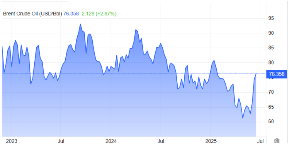 Cuối tuần qua, khi Israel tấn công các cơ sở hạt nhân và quân sự ở Iran, sự lo ngại gián đoạn nguồn cung đã tăng cao, khiến giá dầu tăng mạnh nhất kể từ đầu năm tới nay. Giá dầu Brent bật tăng mạnh và đang giao dịch ở mốc quanh $74/thùng và chưa có dấu hiệu hạ nhiệt. Tại Hội nghị Năng lượng Châu Á ở Kuala Lumpur hôm thứ 2 vừa qua, các giám đốc của hai công ty năng lượng lớn là Baker Hughes và Woodside Energy đều lo ngại nếu nguồn cung qua eo biển Hormuz bị ảnh hưởng thì giá dầu sẽ chịu nhiều ảnh hưởng tiêu cực hơn nữa. Vì thế, khá khó để dự báo giá dầu trong bối cảnh căng thẳng địa chính trị đang leo thang như hiện nay.
