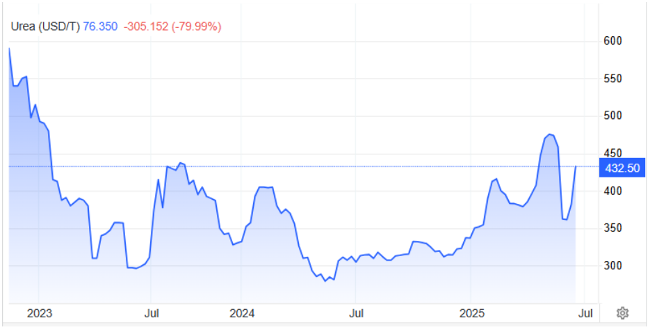Trong bối cảnh giá dầu tăng, các chế phẩm từ dầu mỏ cũng có xu hướng tăng giá theo, trong đó có giá Urea. Hiện tại, giá Urea đang giao dịch quanh mốc $412/tấn, cao hơn mức trung bình là $300/tấn thiết lập trong năm 2024. Cũng theo ban lãnh đạo của DCM, giá Urea được kỳ vọng sẽ tiếp tục tăng trong giai đoạn tới nhờ các yếu tố hỗ trợ sau: