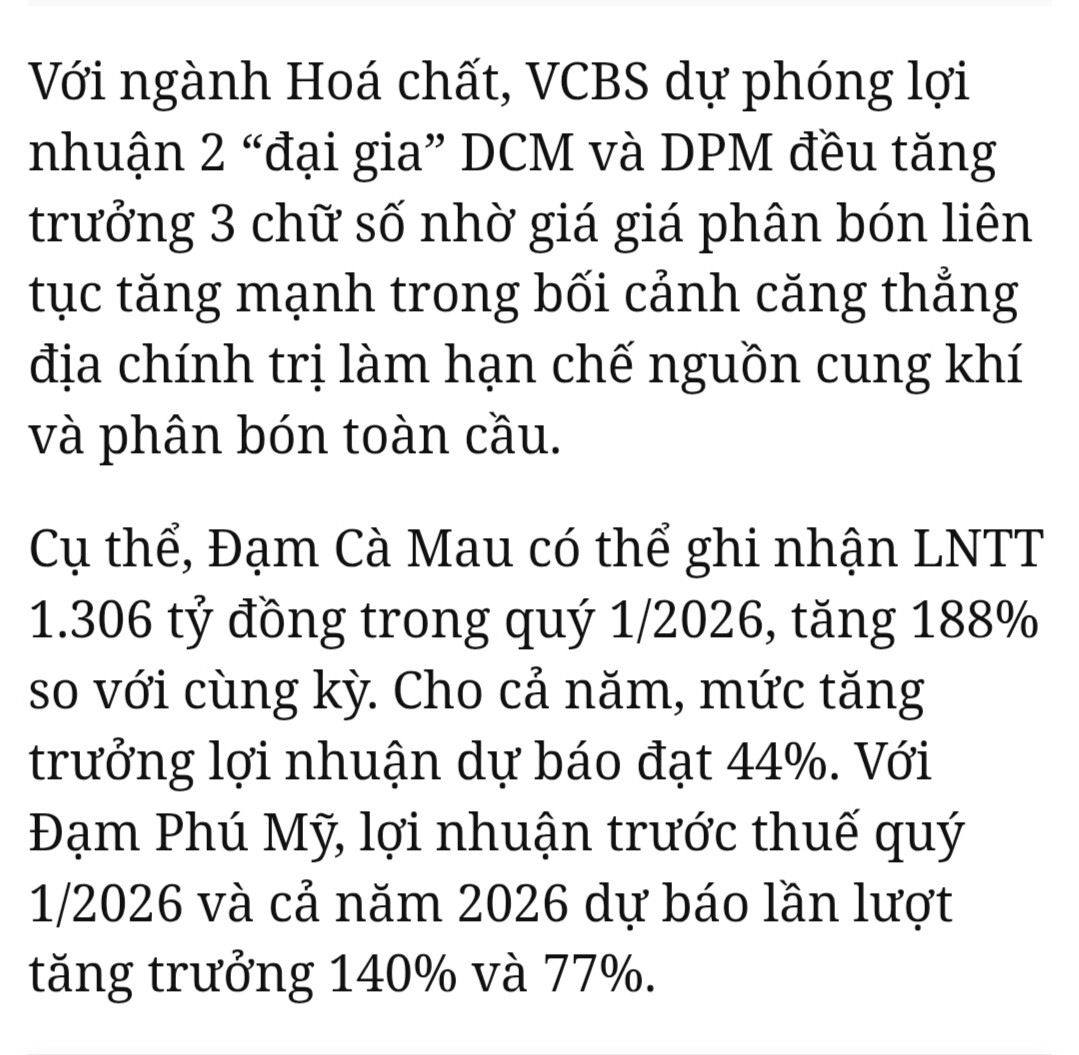 Trên cơ sở đó, triển vọng lợi nhuận năm 2026 vẫn được duy trì với kỳ vọng đạt khoảng 3.000 tỷ đồng, tăng trưởng 55% so với cùng kỳ, nhờ sự hỗ trợ từ sản lượng tiêu thụ ổn định và mặt bằng giá bán urê phù hợp với dự báo. Dù vậy, nhà đầu tư vẫn cần theo dõi thêm diễn biến giá phân bón thế giới và chi phí đầu vào để có đánh giá đầy đủ hơn về biên lợi nhuận trong các quý tới.