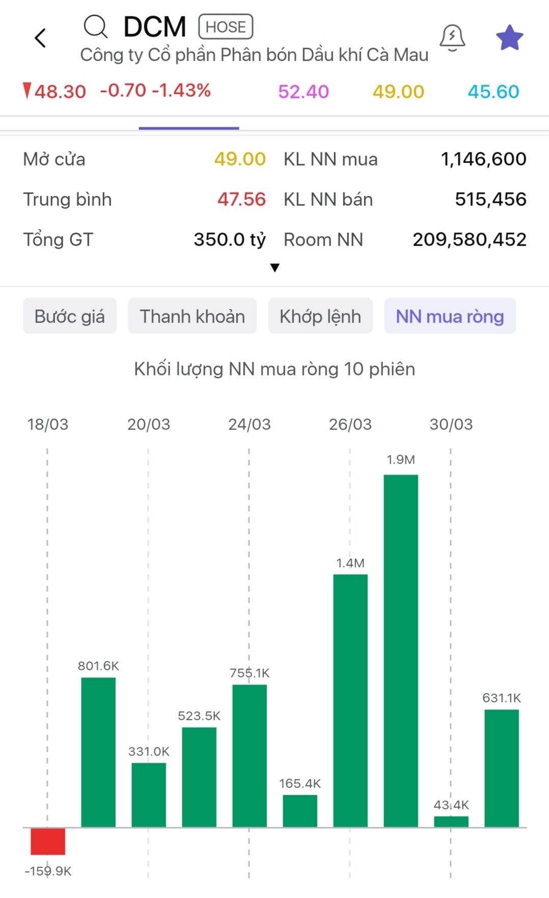 Khối ngoại vẫn miệt mài gom mua ròng DCM suốt tháng 3.