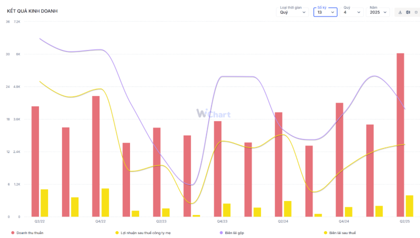 - Với những con số này, LNST của doanh nghiệp đạt 806 tỷ, biên lãi ròng đạt 13,3% - giảm 2,2% so với cùng kỳ do các chi phí tăng, nhưng đang cao hơn Q1/25 và vẫn tiếp tục xu hướng tăng được thiết lập từ Q3/24 tới nay.