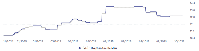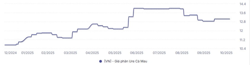 - Giá Ure trong nước đang giao dịch ở mức khoảng 13.100đ/kg trong Q3 – tăng khoảng 22% từ đầu năm, có hạ nhiệt nhẹ cùng đà giảm của thế giới. Theo các chuyên gia thì giá Ure nội địa sẽ giao dịch quanh vùng này cho tới Q1/2026 nếu các sự kiện bất ổn không xảy ra theo chúng tôi phân tích ở phần trên. (Hình 5)