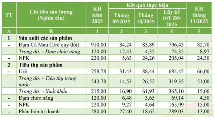 - Sản lượng sản xuất Ure trong tháng đạt 83,9 nghìn tấn, Sản lượng tiêu thụ Ure đạt 88,4 nghìn tấn, trong đó xuất khẩu đạt 61,9 nghìn tấn, trong nước đạt 26,5 nghìn tấn.