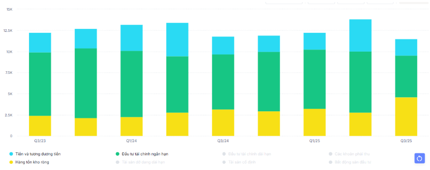 Đầu tiên là khoản mục hàng tồn kho tăng mạnh, có thể nói là con số kỳ lục, đạt 4.596 tỷ đồng. Công ty đã giảm bớt các khoản tiền gửi ngắn hạn để gia tăng mua hàng, thậm chí vay nợ ngắn hạn để tích trữ hàng hóa trong bối cảnh nhu cầu và giá phân bón đang trên đà hồi phục. Tính đến hết Q3/25, DCM ghi nhận nợ vay đạt 1.993 tỷ đồng, tăng 47,8% so với đầu năm, trong đó khoản nợ ngắn hạn chiếm 96% và tăng 59% so với mức đầu năm. Tuy vậy, tỷ lệ đòn bẩy D/E vẫn chỉ khoảng 19%, ở mức trung bình so với các doanh nghiệp cùng ngành.
